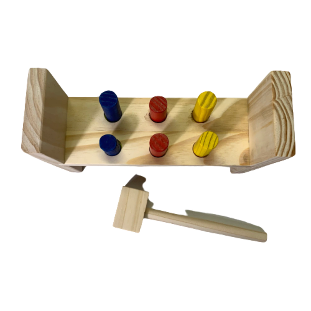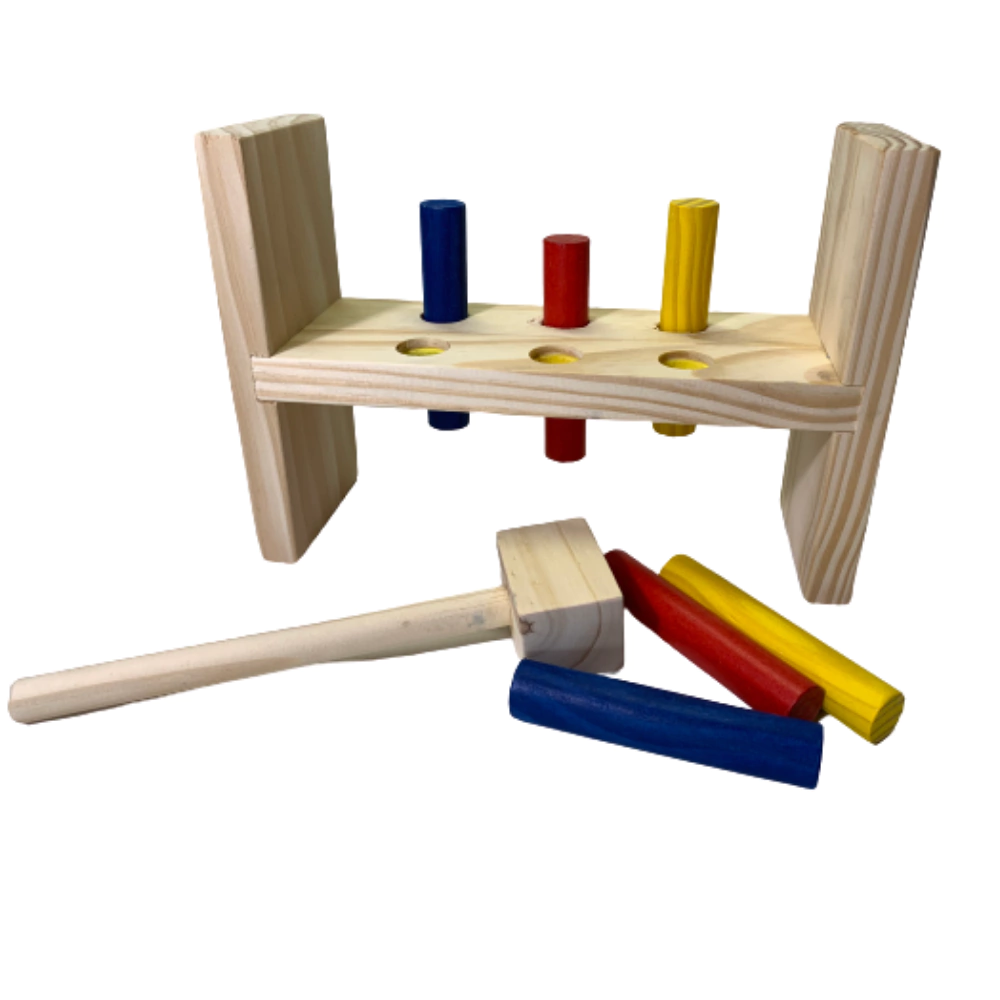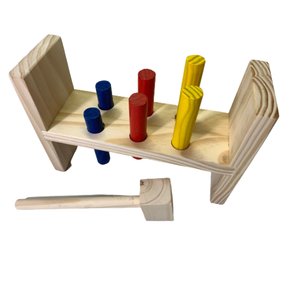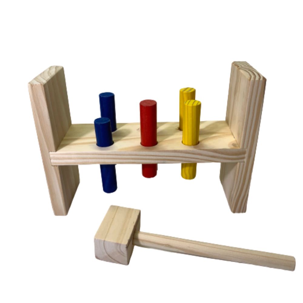 Um jogo que os bebês adoram! Trabalha a coordenação motora e a força! Todo em madeira e com pintura atóxica. Tem dimensões: 9 x 27 x 19cm