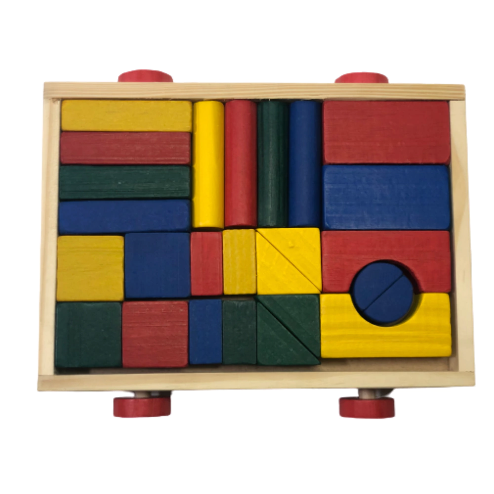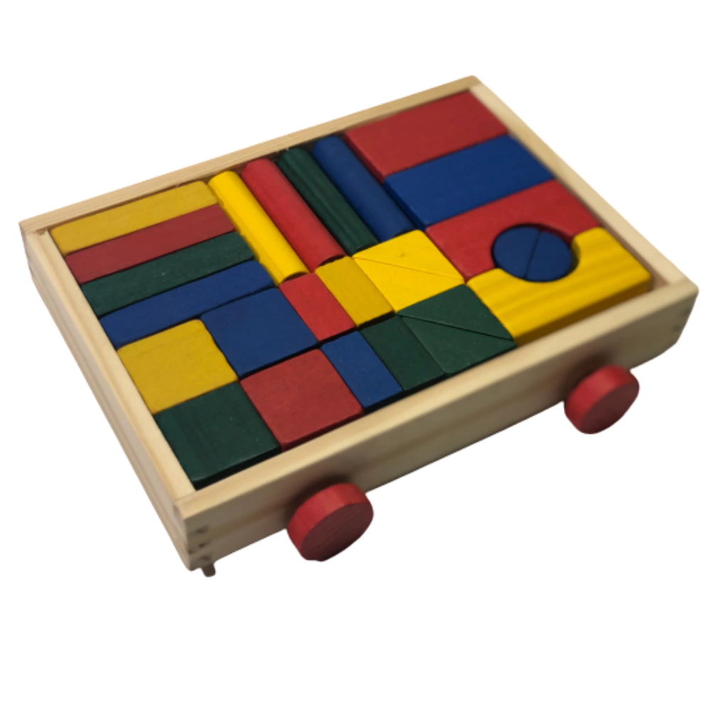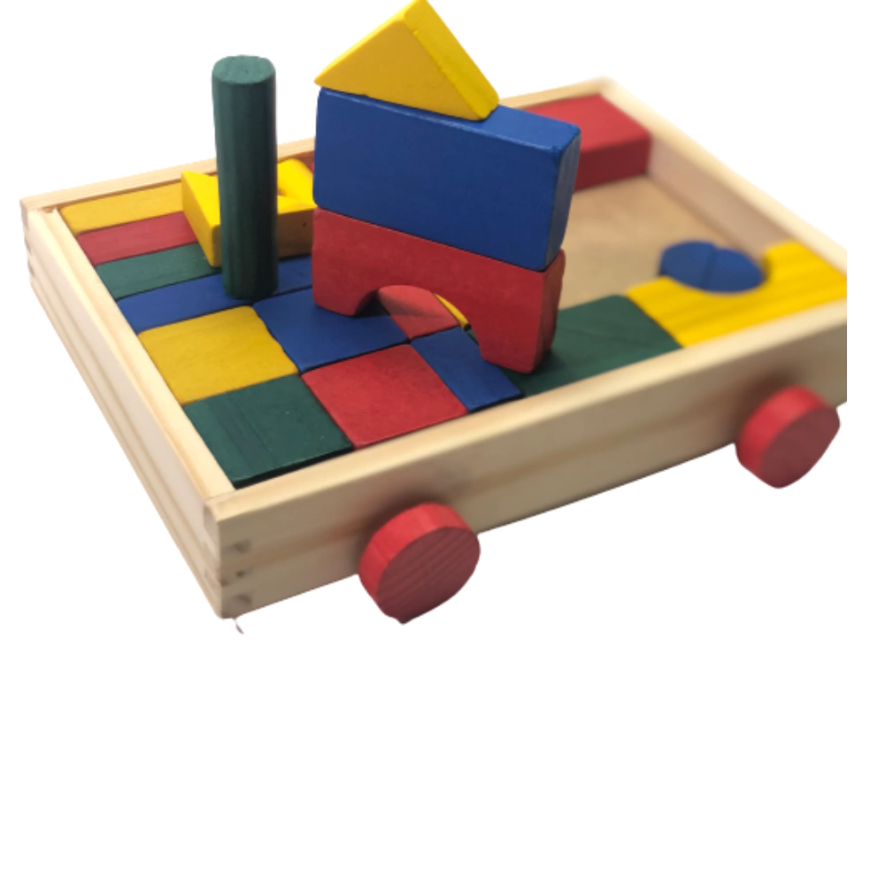 Um carrinho com 26 formas geométricas diversas que trabalham a criatividade e equil~ibrio. Segue a linha montessori e ~e muito atrativo por possuir pe~cas coloridas, pintadas com tinta atóxica. A menor peça mede 3,5 x 2 x 2 cm. Já o carrinho possui 27 x 22 x 5cm