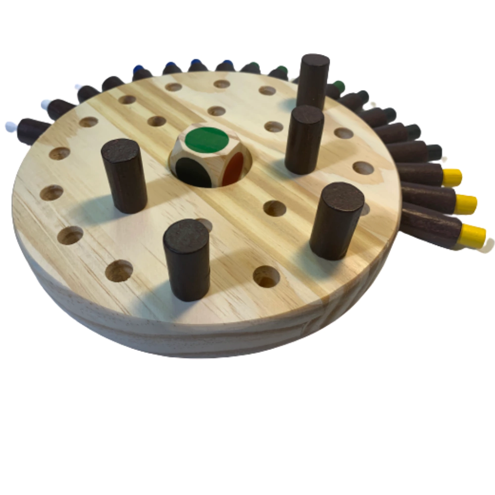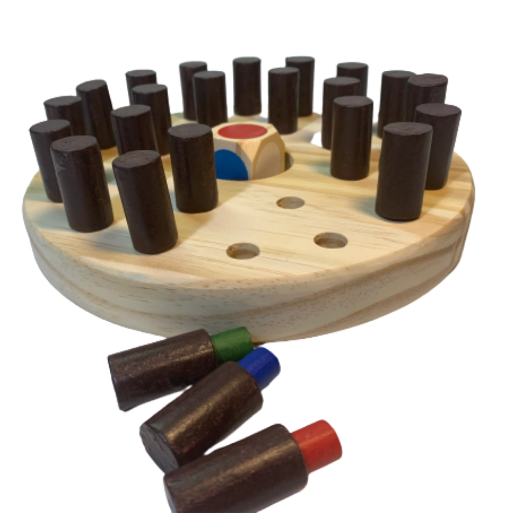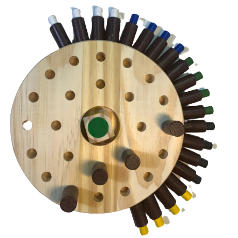 Fabricado todo em madeira tratada, com 24 pinos tingidos para que os veios da madeira não funcionem como marcação, assim os mais atentos não gravam a cor da peça! Acompanha um dado com as 6 cores indicadas nos pinos, manual de instruções e embalagem. Medida 20x20x3cm.
