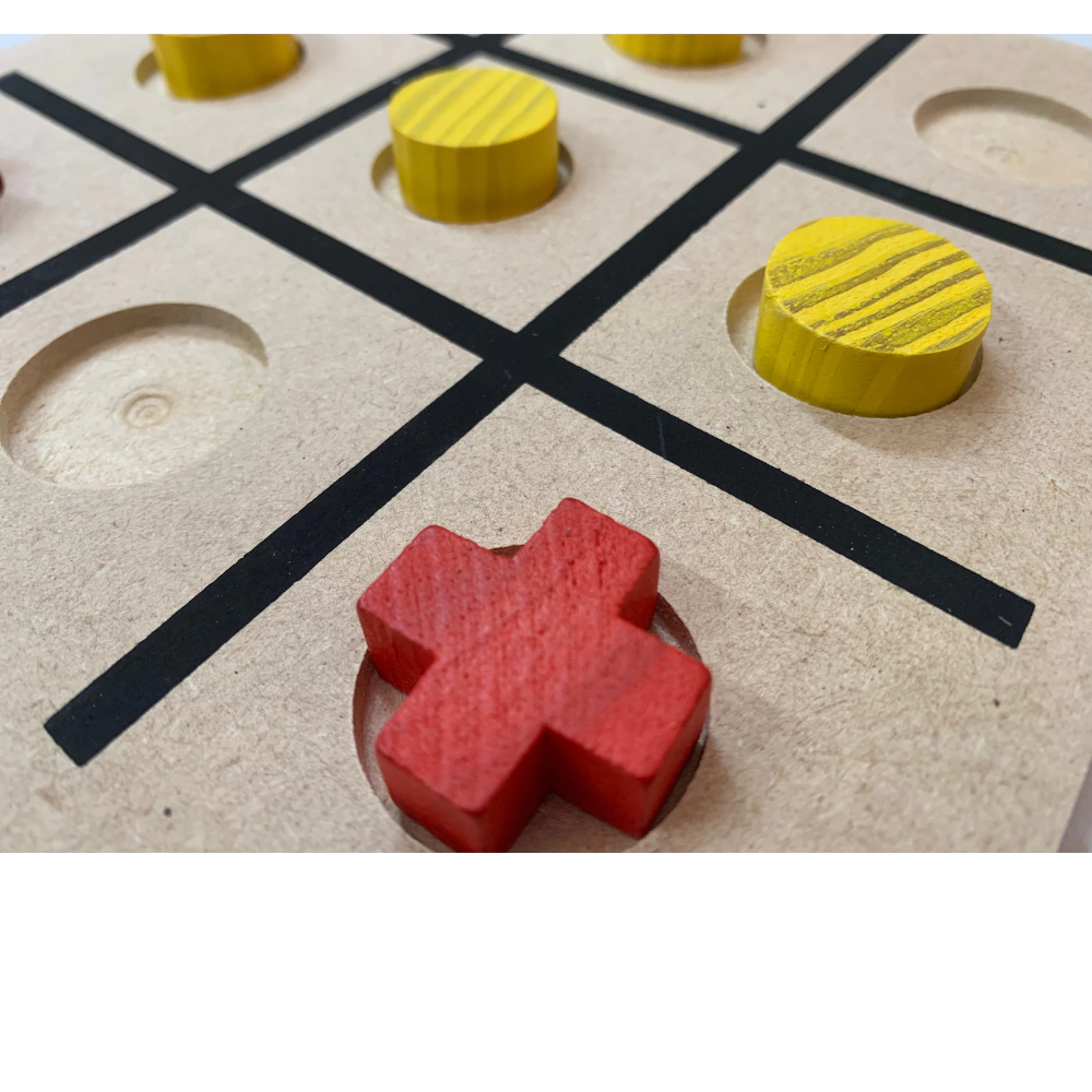 Jogo da velha adaptado: Jogo para inclusão social. Dimensões 20x20 x 1 cm. 5 peças vermelhas com 3 x3 x 1,7 cm e 5 peças amarelas com 2,5 x 1,7 cm. Pintura atóxica. Tabuleiro em MDF serigrafado e peças em pinus.
