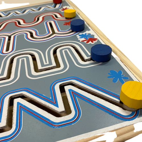 Um painel todo em madeira que trabalha a coordenação motora e traçado. Com cores atraentes e pintura atóxica. Acompanha 4 pinos coloridos em madeira. Medida 26x47x2cm.